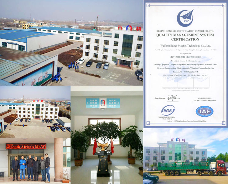 Weifang baite Magnet Technology Co., Ltd . is a modern joint-stock enterprise, which is producing magnetic and power equipment .The service is related to more than 10 areas ,such as electricity , coal ,building materials, metallurgy ,ports ,mining ,nonferrous metals ,power environmental production .At present ,we have provided more than 3000 domestic customers with reliable and value-added and convenient professional equipment and programes, and at the same time ,we occupy more than 60%magnetic separation equipmemt matching share of China ball mill, crusher, iron sand ship and other production industry, Baite has firmly implemented IS09001:2000 international quality magnagement system standard and IS010012 international quality inspection system standard.